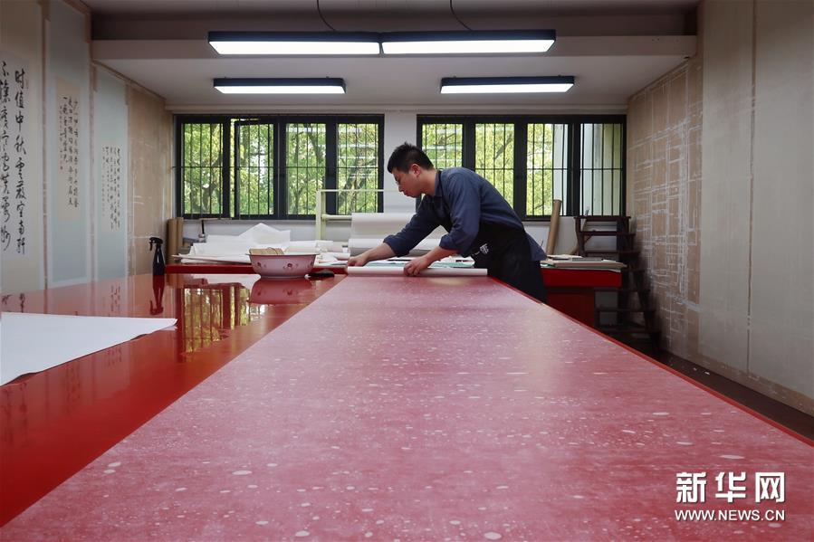 5月13日,古籍修復(fù)師在對(duì)書畫作品進(jìn)行裝裱操作。