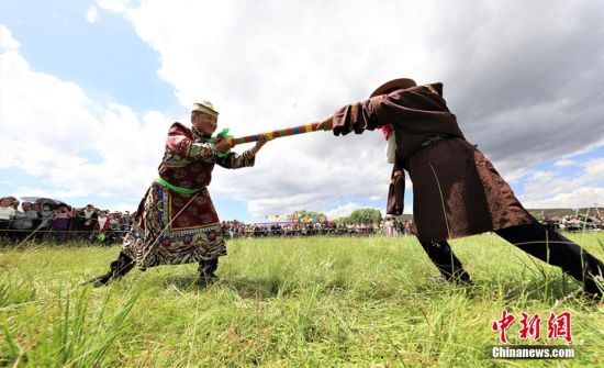 8月8日,甘肅張掖市肅南裕固族自治縣皇城鎮(zhèn)第十六屆民族文化旅游藝術(shù)節(jié)暨傳統(tǒng)體育運(yùn)動會拉開帷幕。賽馬、押加、拔棍、頂杠子、射箭、背垛子等一項(xiàng)項(xiàng)少數(shù)民族傳統(tǒng)體育運(yùn)動項(xiàng)目,吸引上萬觀眾觀看。近年來,肅南縣將體育項(xiàng)目與歷史、民族、文化、旅游有機(jī)結(jié)合,打造民族體育節(jié)慶品牌和運(yùn)動會,使民族傳統(tǒng)體育發(fā)展增加了新的內(nèi)涵,逐步形成了全民健身品牌,影響力不斷擴(kuò)大。圖為參賽選手進(jìn)行拔棍項(xiàng)目比賽。 趙琳 攝