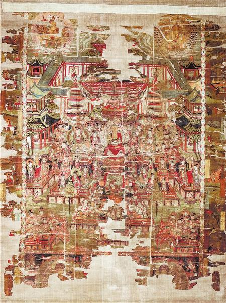 與西方凈土阿彌陀相應(yīng)的是藥師如來的東方凈土,藥師信仰曾在敦煌地區(qū)極為流行。本圖可能是存世敦煌絹畫中最大的一幅,在構(gòu)圖方面可與敦煌石窟壁畫中最復(fù)雜的凈土圖相媲美,是敦煌繪畫中十分罕見的超大型絹畫。