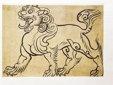 中國(guó)本無獅子,原產(chǎn)地是非洲和南美洲,約在漢武帝時(shí)才經(jīng)西域傳入。獅子作為進(jìn)獻(xiàn)的禮物,是敦煌壁畫中最早出現(xiàn)的動(dòng)物形象之一。由于它的勇猛威儀備受佛教推崇,故在造像和壁畫中曾出現(xiàn)大量的獅子元素。除此,獅子形象還被吸納成為陵墓裝飾和傳統(tǒng)建筑的基本元素。這幅紙本畫,造型準(zhǔn)確、健壯飽滿,昂首闊步、氣宇軒昂,線條遒勁、中鋒用筆,彈性十足,顯示出畫家嫻熟的造型功底,長(zhǎng)短弧線勾勒卷毛,寥寥數(shù)筆,卻靈動(dòng)活潑、灑脫不羈,為不可多得之線描精品。
