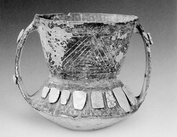 另一件人形三角折帶紋雙足罐,單耳,夾沙紅陶質(zhì)地,高約11厘米,圓鼓的肚子,身著黑色帶狀紋、豎條紋和“Z”字形紋的華麗衣衫,足穿一雙平底大鞋,鞋頭尖而深,似乎是一個(gè)孕婦形象。這可能是3700年前女性著裝的樣式。