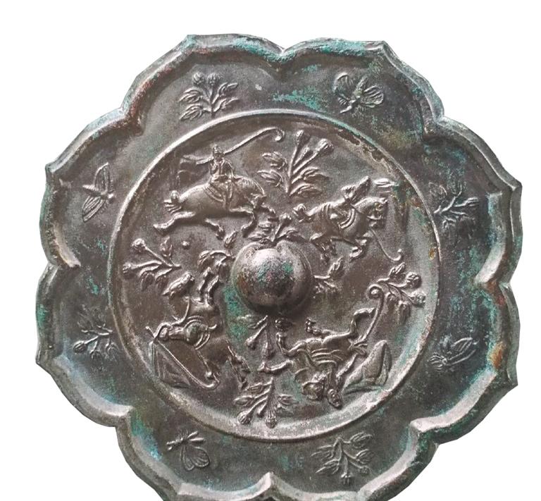 隋唐時期是中國封建政治經(jīng)濟文化高度發(fā)展繁榮的時期,唐代社會經(jīng)濟全面發(fā)展,手工業(yè)各部門也都興旺發(fā)達,青銅鑄造業(yè)中的銅鏡業(yè)尤為突出,無論造型、題材、紋飾、鑄造工藝,都突破了前代的模式,達到了中國古代銅鏡藝術(shù)的巔峰。唐鏡鏡型厚實,方形鏡、菱花形鏡、葵花形鏡流行;紋飾題材多見瑞獸、飛鳥以及葡萄、花草等;瑞獸葡萄鏡最具特色,是中西文化融合的杰作。