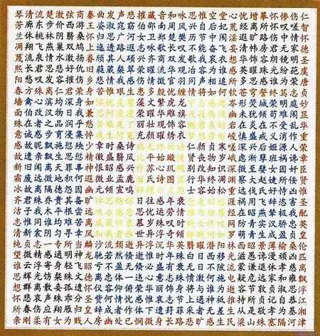 蘇蕙《璇璣圖》不僅是一束厚重的文學(xué)奇葩,也是一幅充滿創(chuàng)意的藝術(shù)巨制。她將詩(shī)歌的載體從傳統(tǒng)簡(jiǎn)帛紙張轉(zhuǎn)換成為錦。錦是有彩色花紋的高級(jí)絲織品。以錦為書寫材料制作《璇璣圖》,除詩(shī)歌本身的創(chuàng)作外,首先需要染絲紡織。錦織好后,又要對(duì)《璇璣圖》謀篇布局,劃區(qū)設(shè)色,書詩(shī)于錦,然后一針一針地將它繡出來(lái),變?yōu)榛匚腻\字。那每一道工序,要求都極精細(xì),不得有半點(diǎn)疏忽,不然就會(huì)留下污點(diǎn)和遺憾。蘇蕙集眾藝于一身,完美地將其制作出來(lái),體現(xiàn)了她的綜合藝術(shù)才能。取名“璇璣(泛指北斗)圖”,寓意它像北斗,可以旋轉(zhuǎn)地讀。它是在華美的錦上,又以五彩繽紛的絲線繡上《璇璣圖》,不僅顏色更加艷麗,而且那841個(gè)金玉珠璣般文字,展現(xiàn)的令人眼花繚亂的詩(shī)歌園地,更是前不見古人,后不見來(lái)者,比錦繡的光彩更加耀眼奪目。