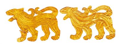 受草原文化影響,虎的造型更具藝術(shù)性,形式亦豐富多彩。甘肅省博物館藏的西周虎紋耳形銅鉞,整體似半環(huán),鑄猛虎紋,虎背為刃。尾下有短胡兩穿,尾、雙爪上鑄凹槽,虎首下彎,張口含銎,露牙睜目,領(lǐng)內(nèi)有一圓形穿孔。甘肅省文物考古研究所藏的戰(zhàn)國(guó)金帶鉤,鉤首為長(zhǎng)頸龍首狀,頸部為三棱狀,肩部三角形邊框內(nèi)鏤空雕鑄對(duì)稱和狼形圖案。鉤身為長(zhǎng)方形,邊框內(nèi)鏤空雕刻一組正反相對(duì)稱的虎噬大角羊圖案。張家川回族自治縣博物館藏的戰(zhàn)國(guó)晚期的虎形金飾片,虎尖耳上翹,大嘴張開(kāi),鬃毛卷曲上翹,尾前卷于背部與鬃毛相連,四足著地做行走狀,栩栩如生地展現(xiàn)了虎行走的動(dòng)感之態(tài)。甘肅省博物館藏的戰(zhàn)國(guó)虎噬羊紋金飾片,虎張口露齒,垂首蹲踞,虎口銜羊,前爪按住羊肩部,后爪抓住羊臀部,羊四肢跪地作掙扎狀,活靈活現(xiàn)地展現(xiàn)出猛虎捕食羊的瞬間動(dòng)態(tài),形象逼真。這些虎文物都是此次展覽中的亮點(diǎn)。