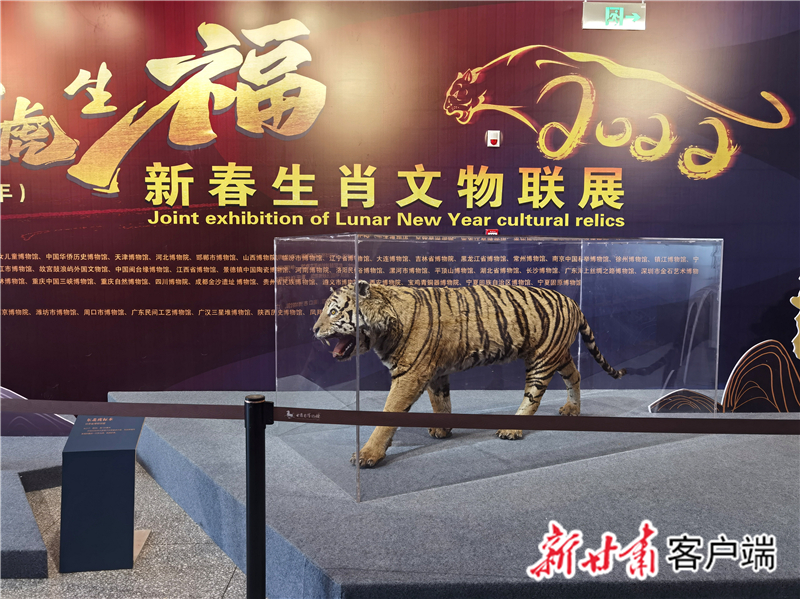 同時(shí),還展出了甘肅省博物館甄選的全省20余件具有代表性的虎元素文物及自然標(biāo)本。這些展品中,最亮眼的當(dāng)屬甘肅省博物館館藏的一具野生東北虎標(biāo)本——體型較大、花紋斑斕、毛色光潔。
