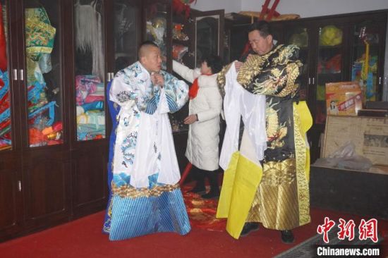 2月16日,表演者正在甘肅蘭州市永登縣苦水街穿上傳統(tǒng)戲服,準備高高蹺表演?!【琶赖┰觥z