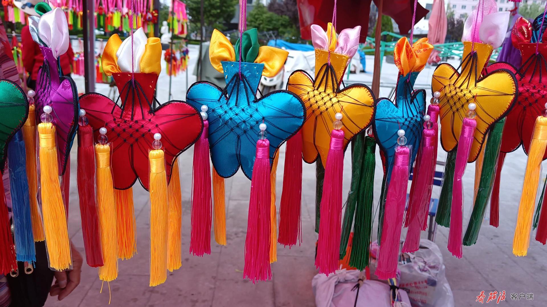 戴荷包是端午節(jié)的傳統(tǒng)習(xí)俗之一,節(jié)前,莊浪縣文化廣場(chǎng)荷包集中攤賣(mài)點(diǎn)荷包琳瑯滿目,做工精美、顏色艷麗,猶如一場(chǎng)藝術(shù)盛會(huì)?;t柳綠的“荷包”里再裝上多味中藥配制的香草,不僅色彩斑斕,而且醇香撲鼻。
