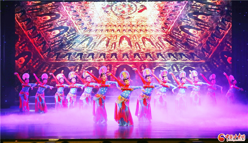除了甘肅省民族歌舞團和西北民族大學舞蹈學院聯袂獻上的精彩節(jié)目外,當晚,肅州區(qū)文化館還為觀眾奉獻了舞蹈《西域羯鼓》。據悉,羯鼓源自西域,狀似小鼓,兩面蒙皮,均可擊打,既能表現快速緊急或激烈的情緒,又可以用散淡悠長來營造靜謚雅致的氛圍。表演中,舞者著霓裳,帶搖冠、掛嚶珞,貼著金花的衣裙飄曳、巾帶飛舞,四周天花飛落,如夢如幻。該節(jié)目通過歡快的音樂、輕快的舞步、流暢的隊形變換等形式,展現了極具特色民族舞蹈風格,也反映了隴原兒女團結奮進、昂揚向上的精神面貌。