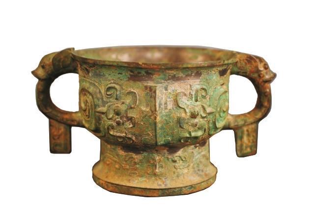 器物保存完整,紋飾十分講究,造型圖案十分精美,為國(guó)家一級(jí)文物。通高14.6厘米,口徑19厘米,底徑14.3厘米。鑄造工藝在西周時(shí)期屬于較為上乘之作。夔紋是圖騰紋飾,《說(shuō)文》中云:“夔如龍而一足。”簋的兩邊為耳,呈環(huán)狀。上部各有一變形的龍首,顯得十分莊重、大氣。整個(gè)器物周身布滿綠銹,脫銹之處露出青銅光澤,透出歷史的厚重之美。