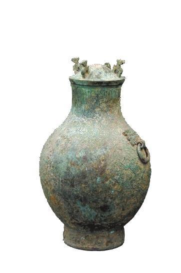 1986年出土于甘肅省隴南市兩水鎮(zhèn),為戰(zhàn)國(guó)時(shí)期盛酒器,國(guó)家一級(jí)文物,也是隴南市博物館鎮(zhèn)館之寶。大銅壺為拱狀圓頂環(huán)狀千龍鳥紋蓋系,其下有牙子蓋,壺體平口唇,長(zhǎng)頸,圓鼓腹,高圈足,肩部有兩鋪首飾環(huán),其一丟失。唇帶無(wú)飾,頸、肩、腹部全施菱形交叉組合之反復(fù)相間的變形龍鳳紋的主體圖案。肩部有獸面銜環(huán)耳,可以清晰看到怪獸的眼睛。其空間墜飾以花葉云氣勾連紋飾。近底部有一圈寬圈帶紋。高圓足部有兩道帶紋。大銅壺通體紋飾復(fù)雜,以鳳紋為主,表明銅壺等級(jí)較高,保存非常完好。
