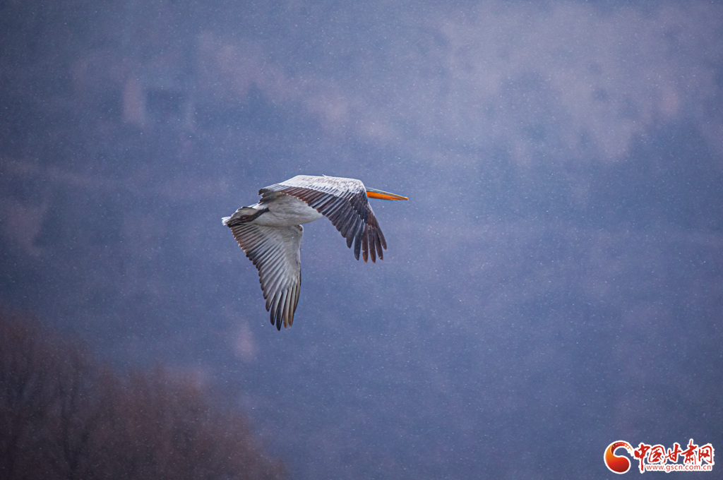 當(dāng)天,天空下著大雪,天氣寒冷,一位野生鳥(niǎo)類攝影愛(ài)好者驚喜地在崇信縣汭河段發(fā)現(xiàn)了一只卷羽鵜鶘盤(pán)旋于河道上空,經(jīng)過(guò)跟蹤其降落于發(fā)現(xiàn)地20里外的銅城水庫(kù)附近水域,與蒼鷺混群。