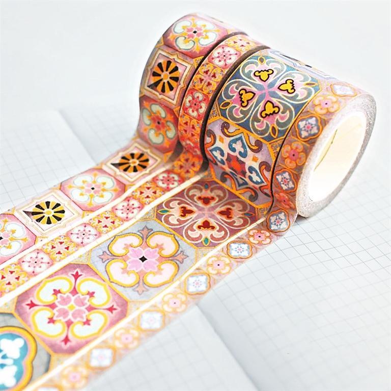 紋樣膠帶——在眾多文創(chuàng)產(chǎn)品中,膠帶的銷售或人氣排行榜靠前。紙膠帶雖是個小物件,但藝術化的紙膠帶卻能夠滿足多種需求,適應多層次人群的需求。圖形多來自器物上的印刻、繪制圖案,或抽象或具體。這也就體現(xiàn)了兩種效果,一種是文藝范,另一種是趣味感,來自重構傳統(tǒng)的高大上,消解歷史的審美觀。設計靈感來自中國傳統(tǒng)紋樣,融合敦煌元素,有層次的色彩斑斕,圖案以及細節(jié)都恰到好處。