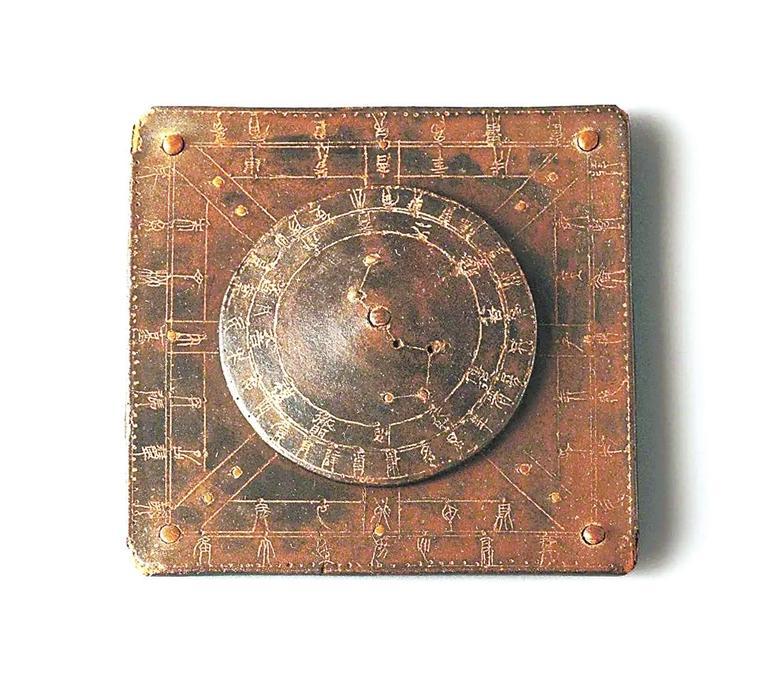 1972年武威市磨嘴子漢墓出土的這件漆栻盤,直徑6厘米,厚1厘米,地盤邊長9厘米,木胎,髹深褐色漆。由圓形的天盤和方形的地盤構(gòu)制而成,天盤位于地盤之上,正中心以竹軸貫聯(lián),使天盤可以轉(zhuǎn)動(dòng)。天盤中陰刻兩個(gè)同心圓,將其分為三區(qū):內(nèi)區(qū)以竹珠鑲嵌北斗七星,星間刻線相連,斗柄中節(jié)穿過圓心。中區(qū)內(nèi)隸書陰刻十二月神,外區(qū)陰刻篆書二十八宿名。地盤以兩個(gè)相套的正方形分為三區(qū):內(nèi)區(qū)納天盤,中區(qū)陰刻篆書十天干中的八干(不刻戊己)和十二地支名,外區(qū)陰刻篆書二十八宿名。