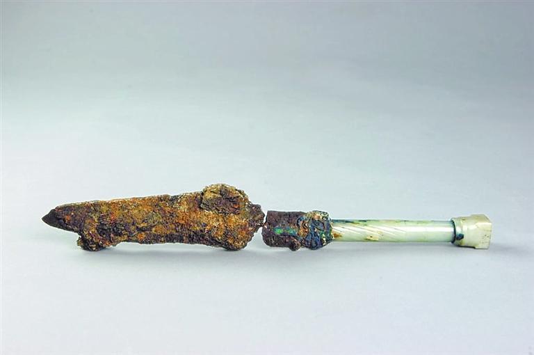 玉柄鐵劍出土于河南三門峽虢國國君虢季的墓葬,全長34.2厘米,其中劍柄長12.2厘米,劍身長22厘米。劍柄為銅芯,起到連接劍柄和劍身的作用,銅芯外鑲有晶瑩透亮的和田美玉和綠松石,并有精美的竹節(jié)飾紋,劍身和劍柄的結(jié)合處也鑲有綠松石。劍身經(jīng)由北京科技大學(xué)冶金與材料史研究所鑒定,是由塊煉法鍛制而成,劍身外有絲織品包裹的痕跡,應(yīng)當(dāng)是被絲織品包裹后放入劍鞘。劍鞘則由牛皮精制而成。這把玉柄鐵劍不僅制作精美,而且其利用玉、銅、鐵三種材料制作而成,是我國目前考古發(fā)掘出土的年代最早的人工冶鐵制品。它將我國的人工冶鐵歷史推前了近兩個(gè)世紀(jì),被專家們譽(yù)為“中華第一劍”。