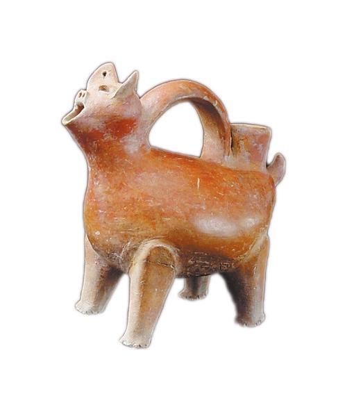 紅陶獸形壺,高21.6厘米,夾砂紅陶,通體磨光,遍施紅色陶衣,光潤亮澤。器型圓面聳耳,拱鼻,張口,耳穿小孔,四肢粗壯,短尾上翹,背裝弧形提手,尾根部一筒形注水口,嘴可往外倒水,腹部鼓起加大了容積,四足立起可供加熱,使用方便,造型生動(dòng)美觀,集實(shí)用與仿生藝術(shù)于一身,是大汶口文化獨(dú)有的器形,充滿了創(chuàng)造性的靈感,是新石器時(shí)代一件難得的陶器珍品。