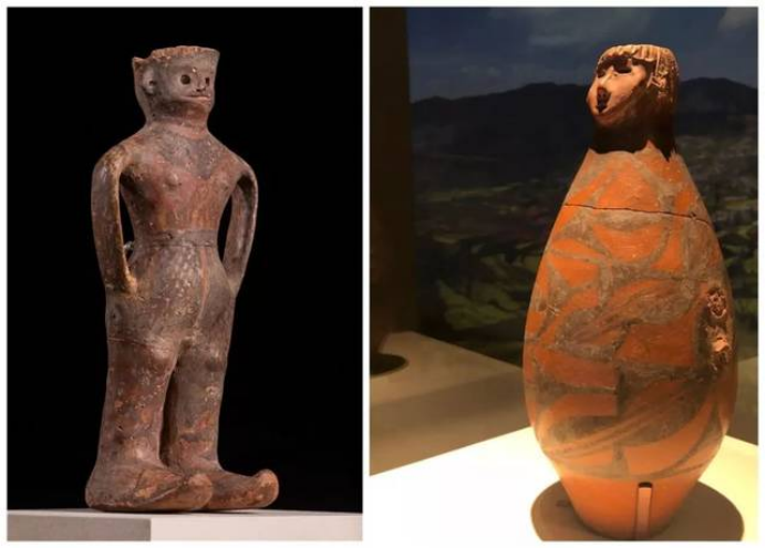 隴東有少女,而位于河西的玉門(mén)火燒溝同樣出土了一件距今3700多年的人形彩陶罐,被人們稱做“河西少年”。在2019年“少女”與“少年”這一對(duì)“金童玉女”就已經(jīng)邂逅了,2019年中國(guó)國(guó)家博物館展出“絲路孔道——甘肅文物精華展”時(shí),在展覽序廳門(mén)口了生了這樣一場(chǎng)友愛(ài)的“接力”。隴東大地灣的可愛(ài)“少女”——人頭形器口彩陶瓶說(shuō):“出來(lái)有一陣子了,在京城過(guò)了端午節(jié),該回家了!在京的時(shí)間雖短,但我很高興作為代表在國(guó)家博物館迎接全國(guó)、全世界的觀眾,希望還有機(jī)會(huì)可以再來(lái)!”。河西火燒溝的酷“少年”——人形彩陶罐說(shuō):“您回家了,我接替您的工作,在展覽的大門(mén)口,繼續(xù)帶領(lǐng)觀眾領(lǐng)略多彩厚重的甘肅歷史文明!”