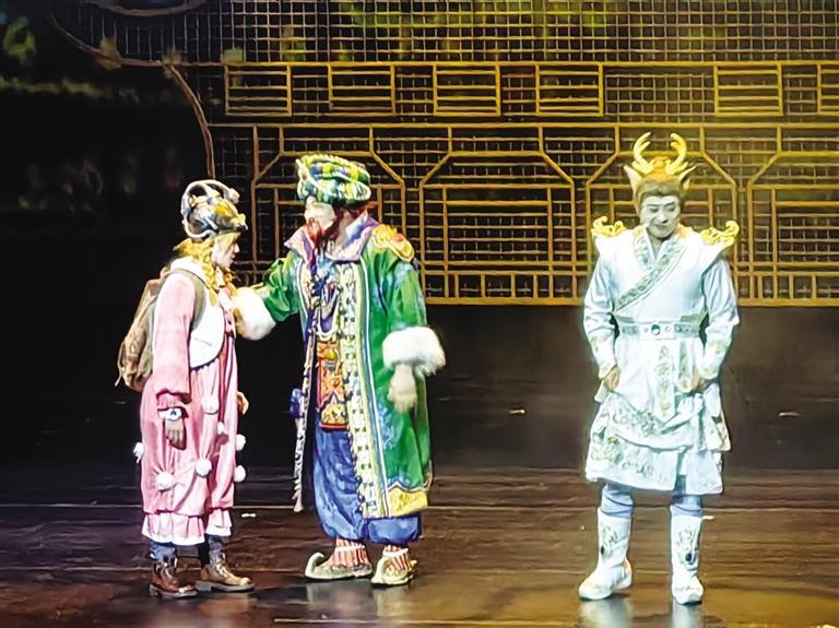 演出現(xiàn)場(chǎng),大美敦煌被搬到舞臺(tái)上,星云變幻間,時(shí)空在劇場(chǎng)轉(zhuǎn)換,鹿鳴、莉娜、巴巴亞穿梭在沙漠、月牙泉和莫高窟、敦煌市集之間,與“先知”對(duì)話,向神仙請(qǐng)教,與沙塵暴斗爭(zhēng),根據(jù)蛛絲馬跡尋找3件天宮樂(lè)器的下落。