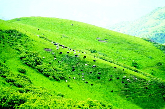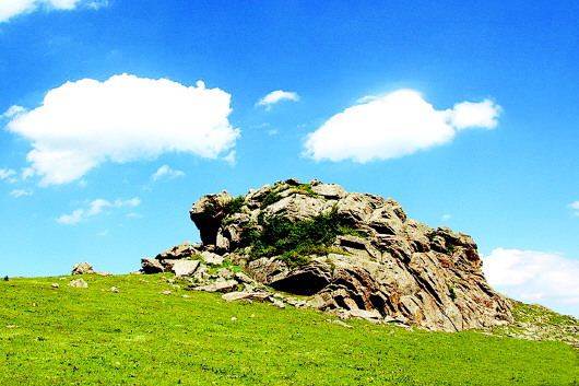秦人遠(yuǎn)去了,只留下那些讓后人至今懷想不已的地名,諸如石鼓山、景墩梁、牧馬梁、上店子、下店子、大卜峪、瓦泉峪等,而尤以石鼓山最為著名,著名得連那部白發(fā)三千丈的《水經(jīng)注》里,都記載著它的故事:“山在梧中聚,有石鼓不擊自鳴,鳴則兵起。漢成帝鴻嘉三年,天水冀南山有大石自鳴,聲隱隱如雷,有頃止,聞?dòng)谄较宥偎氖铮半u皆鳴。石長丈三尺,廣厚略等,在崖勒,去地百余丈,民俗名曰石鼓。”石鼓山是朱圉山最高峰,海拔2625米,山峰陡峭,人跡罕至,遠(yuǎn)望如石鼓,近看似臥牛,茂林幽泉,森秀無比。初春時(shí)節(jié),萬物透綠而石鼓白雪皚皚;大雨前夕,飛鳥翱翔而山上煙云彌漫。更為神奇的是,山丘之巔,突兀一石,酷似一頭臥北朝南的耕牛,翹首做犀牛望月之狀,人稱臥牛山。臥牛山石頸之下,有一巨石,其面圓而平,每當(dāng)正午陽光直射之時(shí),遠(yuǎn)遠(yuǎn)望去,石面宛如獸皮所蒙,恰如一面威風(fēng)凜凜的巨型戰(zhàn)鼓,恍惚之中,有如雷聲隱隱而來,民呼之曰石鼓,石鼓山因此得名。石鼓山素來以厚重的人文歷史和優(yōu)美的草原風(fēng)光而著稱,尤為聞名的“石鼓擎雪”,自古就是“甘谷八景”之一。千百年來,石鼓山甘愿舍棄繁華,遠(yuǎn)離人世,在淡泊寧靜的歲月中,固執(zhí)而堅(jiān)定地守望古坡,守望古坡人家。