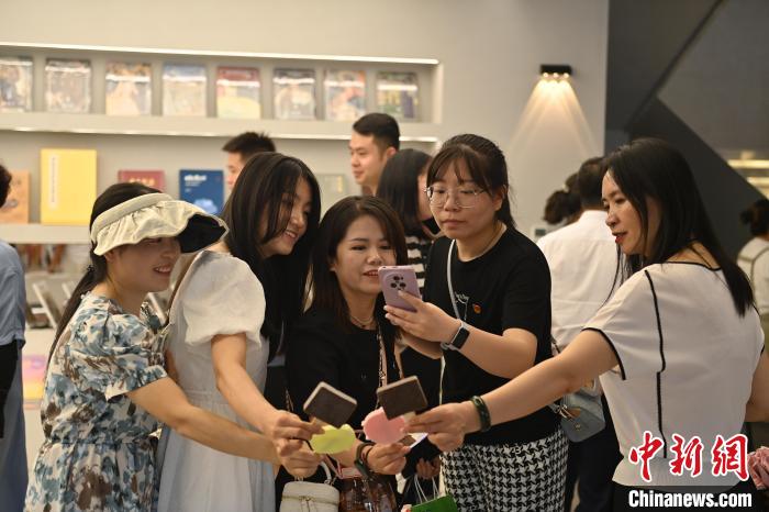 6月19日,甘肅省博物館藝術(shù)生活館在甘肅蘭州開館。該館是甘肅省博物館打造的一處復(fù)合型高價(jià)值文化空間,融合了咖啡、烘焙、展覽、藝術(shù)書店、文創(chuàng)銷售等多樣化業(yè)態(tài)。圖為顧客與自己挑選的蘭州凍梨文創(chuàng)玩偶合影。中新社記者 李亞龍 攝