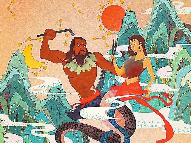 在天地還沒形成,世界處于混沌狀態(tài)時,已有伏羲、女媧二神,他們結(jié)為夫婦,生子四人。他們開辟了天地,是因為懂得萬物參化的法度。為此,他們跋山涉水觀察山川自然,并疏通山陵,使山川與四海通氣,協(xié)和陰陽,使天地星辰有序運轉(zhuǎn)。當(dāng)時沒有時序日月,他們制定了歷法,讓四個兒子輪流協(xié)理和代表四時。又過了一千數(shù)百年,帝俊生出日月,從此九州太平,山陵安靖。四神造了天蓋并用五色木的精華加固天蓋,使它旋轉(zhuǎn)。炎帝又讓祝融助四神奠定三天四極,敬事九天,以求太平。帝俊又制定日月運行的規(guī)則。后來,共工制定了十天干和閏月,分一天為宵、朝、晝、夕,歷法更為準(zhǔn)確。于是,百神司職、日月有序、風(fēng)和雨順的世界形成了。