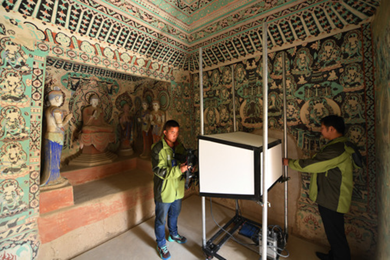 圖為在敦煌莫高窟第376窟,工作人員開展數(shù)字化采集工作(2017年4月17日攝)。新華社記者范培珅攝