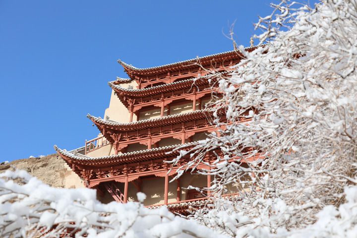 2022年3月24日至25日,甘肅省敦煌市迎來一場春雪。雪后的世界文化遺產(chǎn)敦煌莫高窟銀裝素裹,景色如畫。圖為3月25日拍攝的雪后的敦煌莫高窟景區(qū)九層樓。新華社記者李俞輝攝