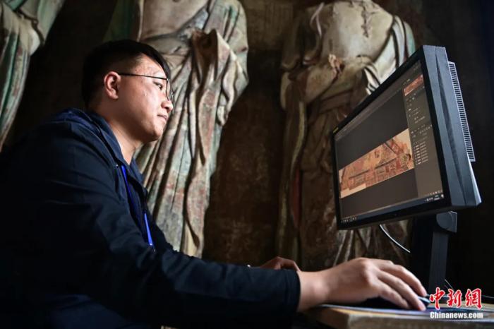 甘肅天水,工作人員在麥積山石窟內(nèi)檢查數(shù)字化掃描的造像和壁畫信息。九美旦增 攝