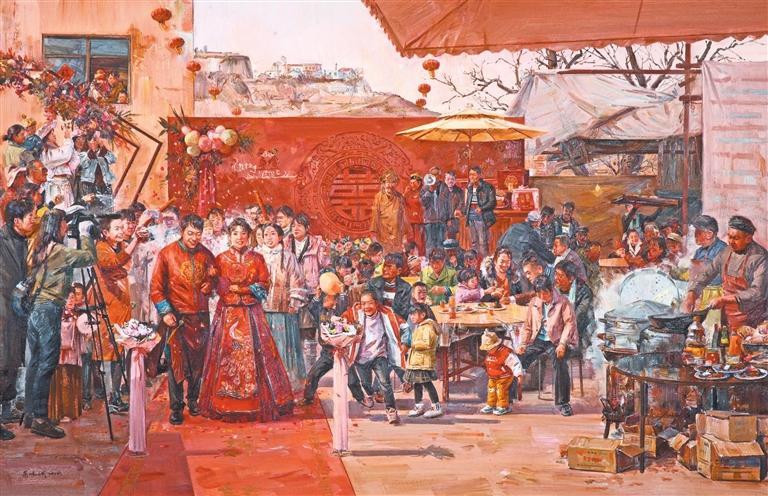 《成紀(jì)二月喜盈門》描繪了秦安一對新人舉辦婚禮的場景。身著傳統(tǒng)服飾的新人,在親朋好友祝福中朝觀眾走來。靜心觀察,會發(fā)現(xiàn)每個人都充滿鮮明的角色感,樸拙的外表、內(nèi)蘊的情感、濃厚的民俗、歡樂的場景,共同交織成一方地域上的斑斕畫卷。