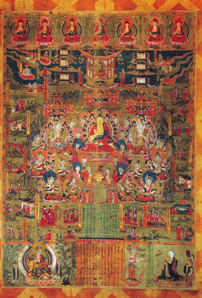 該畫為絹地設(shè)色,出自敦煌莫高窟藏經(jīng)洞。畫面中心為說法圖,一佛二菩薩法相莊嚴,諸菩薩、弟子、比丘、比丘尼、優(yōu)婆塞、優(yōu)婆夷等“赴會圣眾”圍繞周圍。兩側(cè)及上方分布15幅經(jīng)變故事圖,以連環(huán)畫形式鋪陳展現(xiàn)《佛說父母恩重經(jīng)》的基本內(nèi)容。其上繪七佛、彌勒與七寶,其下墨書《佛說報父母恩重經(jīng)變》。絹畫最下方自左向右排布地藏菩薩、《繪佛邈真紀》、引路菩薩及比丘尼戒行邈真像。該絹畫保存完整,色彩絢麗,是敦煌《佛說父母恩重經(jīng)》諸變相中,內(nèi)容最復雜,畫面情節(jié)最多,特點最鮮明,風格最獨特的一幅,且有宋淳化二年(公元991年)明確紀年,具有重要的歷史、藝術(shù)和研究價值。
