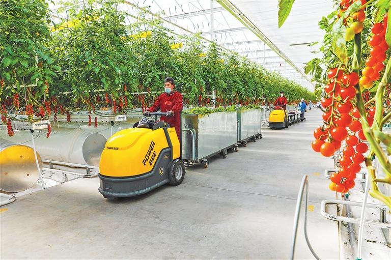 古浪越海農(nóng)業(yè)有限公司智能溫室內,務工人員運送小番茄。 武威市融媒體中心供圖