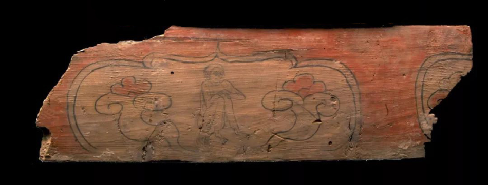 彩繪“猴”生肖木版畫,唐代,一級文物。1979年肅南縣大長嶺唐墓出土。木版畫長73厘米,寬22厘米,猴生肖木版畫呈長方形,墨筆雙線勾勒一壸門開光。壸門內(nèi)墨線勾勒一猴,其雙手環(huán)抱膝蓋至胸前,猴身兩側(cè)繪有兩朵升騰祥云。壸門外飾以土紅色。