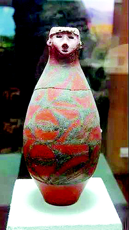 這件距今約6000年的文物,高31.8厘米,口徑4.5厘米,底徑6.8厘米,被許多人稱之為半神半人彩陶瓶。瓶為細泥紅陶質(zhì)地,腹部以上施陶衣。器型為兩頭尖的圓柱體,下腹內(nèi)收。瓶器口為圓雕人頭像,披發(fā),堪稱遠古時期的雕塑杰作。