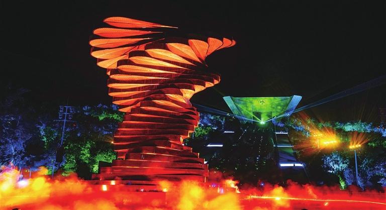 秋日的金川國(guó)家礦山公園樂(lè)聲悠揚(yáng)、光影迷離。夜晚,伴隨著動(dòng)人的旋律,絢爛的光影投射到主界碑“龍首魂”上,金昌元素生動(dòng)地展現(xiàn)在眼前,“鎳都之光”文化展演為旅客帶來(lái)了一場(chǎng)視覺盛宴。