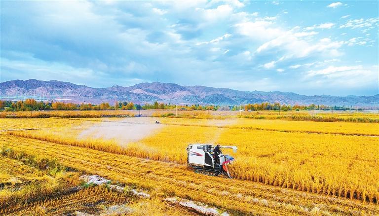張掖市甘州區(qū)烏江鎮(zhèn)大灣村2000多畝稻田一片金黃,村民正在進(jìn)行搶收作業(yè)。新甘肅·甘肅日報(bào)通訊員 楊瀟
