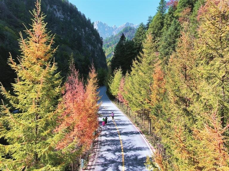 金秋時(shí)節(jié),位于宕昌縣的官鵝溝國(guó)家森林公園秋色盡染,斑斕如畫。
