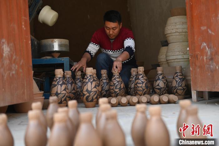4月11日,甘肅省天水市秦安縣康坡村陶藝車間內(nèi),甘肅省級(jí)非物質(zhì)文化遺產(chǎn)名錄秦安陶器燒制技藝天水市級(jí)傳承人康曉龍趕制大地灣文創(chuàng)彩陶。李亞龍 攝