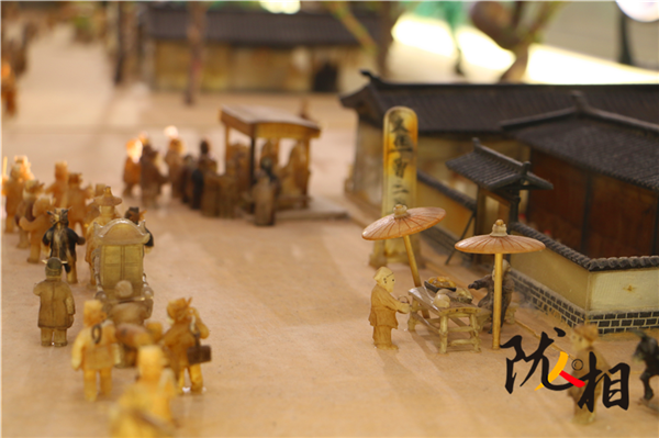 劉金祿歷時25年創(chuàng)作的白牦牛角微雕版《清明上河圖》,長16米,寬1.6米,共微雕人物1460名,動物300余頭、房間400余間、大小船只30余艘、牛馬車輛50余輛。小到杯盞酒蝶,大到雕梁畫棟,都有生動刻畫,徹底將《清明上河圖》由平面畫作搬上了立體展臺。