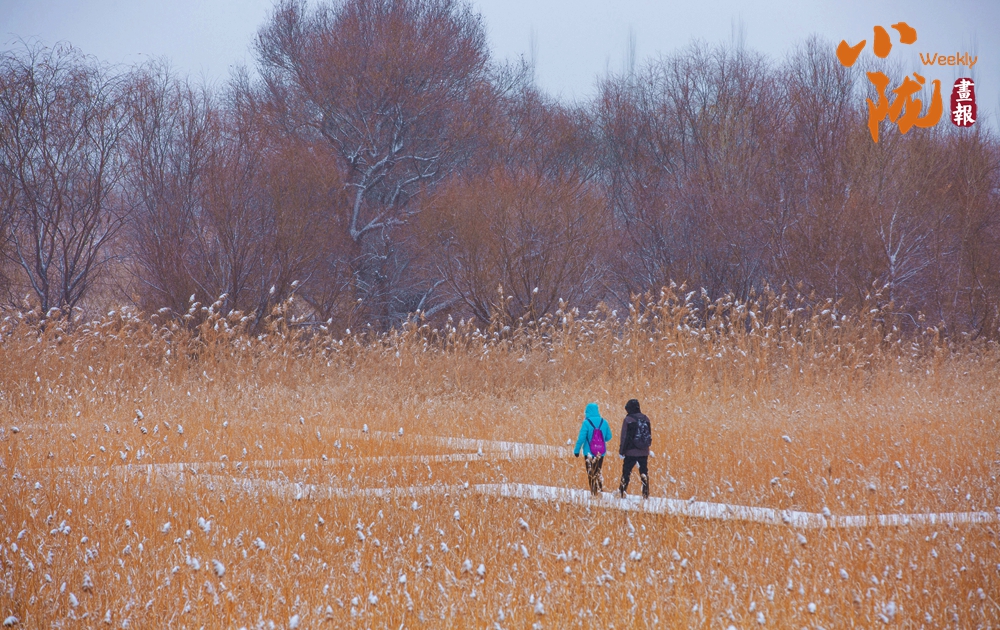 蘆葦金黃,蘆花似雪,輕輕搖曳,似在輕舞,三三兩兩的游人徜徉其中,體味著繁忙的都市生活中難得的休閑與野趣。