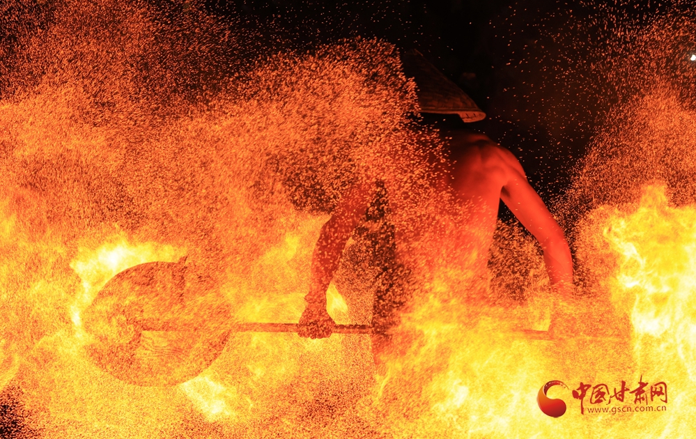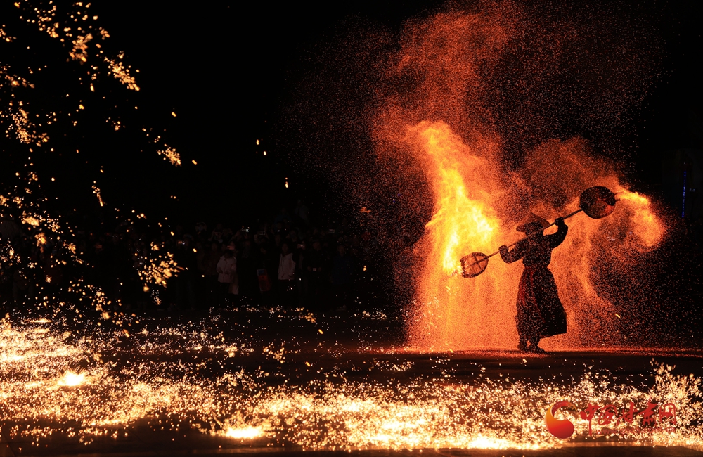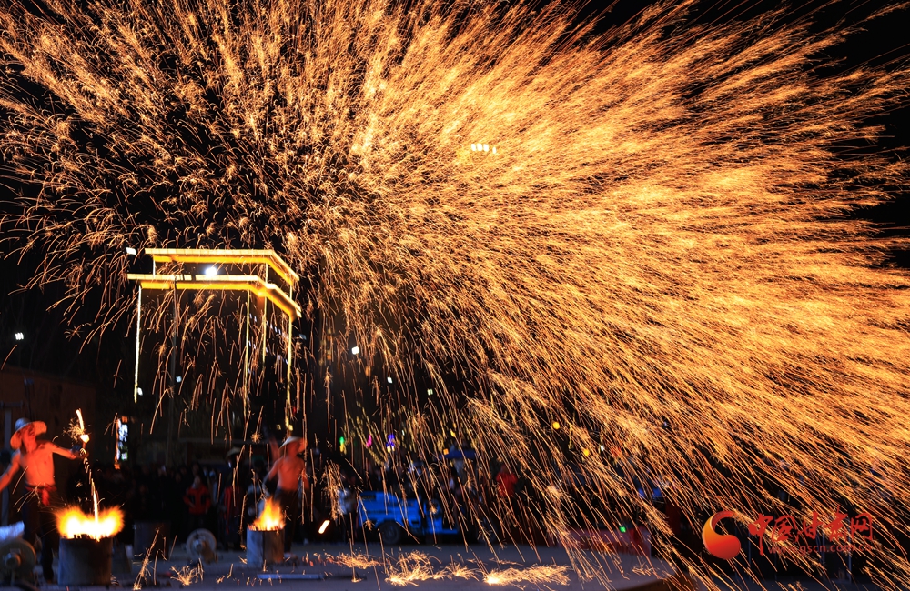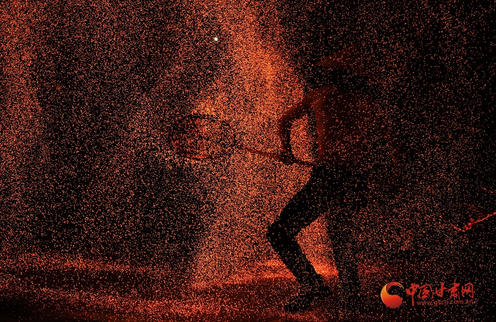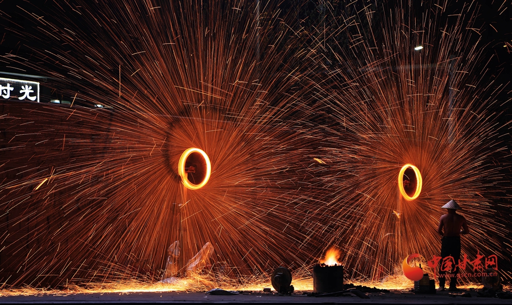 打鐵花表演時,傳承人將生鐵熔到1600℃高溫后,把鐵汁注入“花棒”,用撬棍或木鍬猛擊,使鐵水打上天空四散,形成璀璨絢麗的火樹銀花景觀。