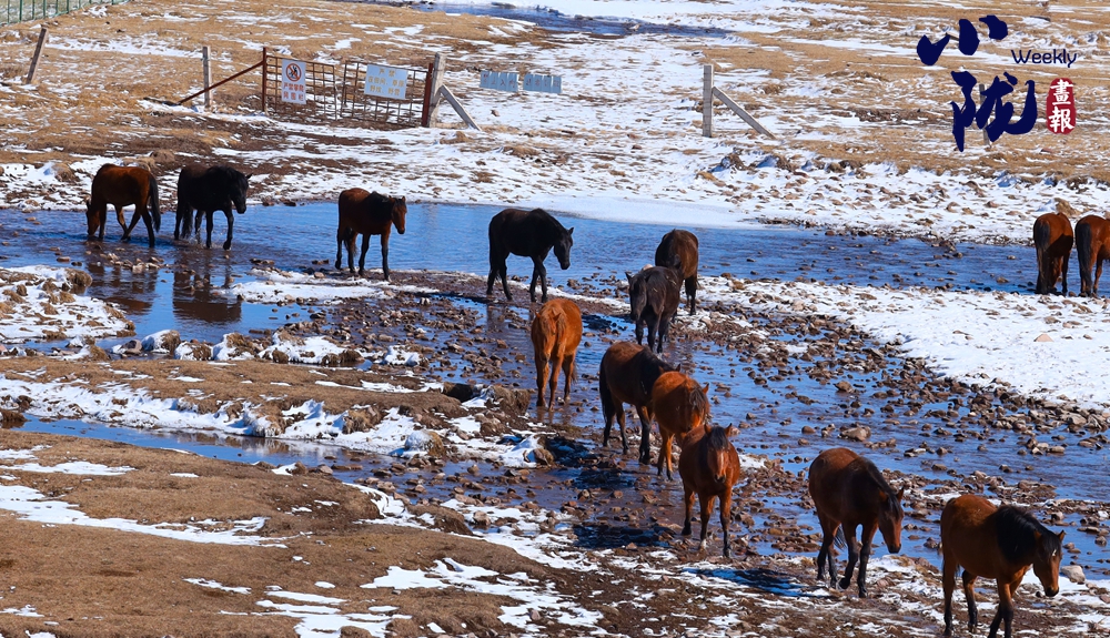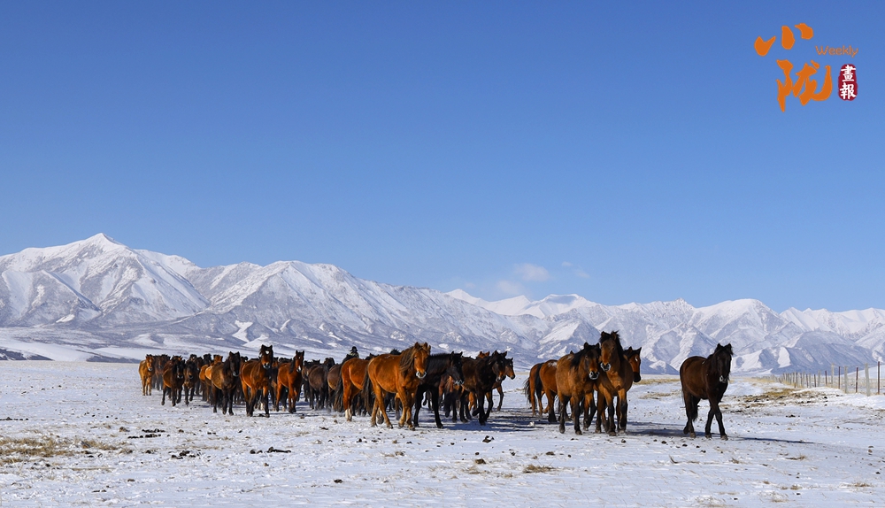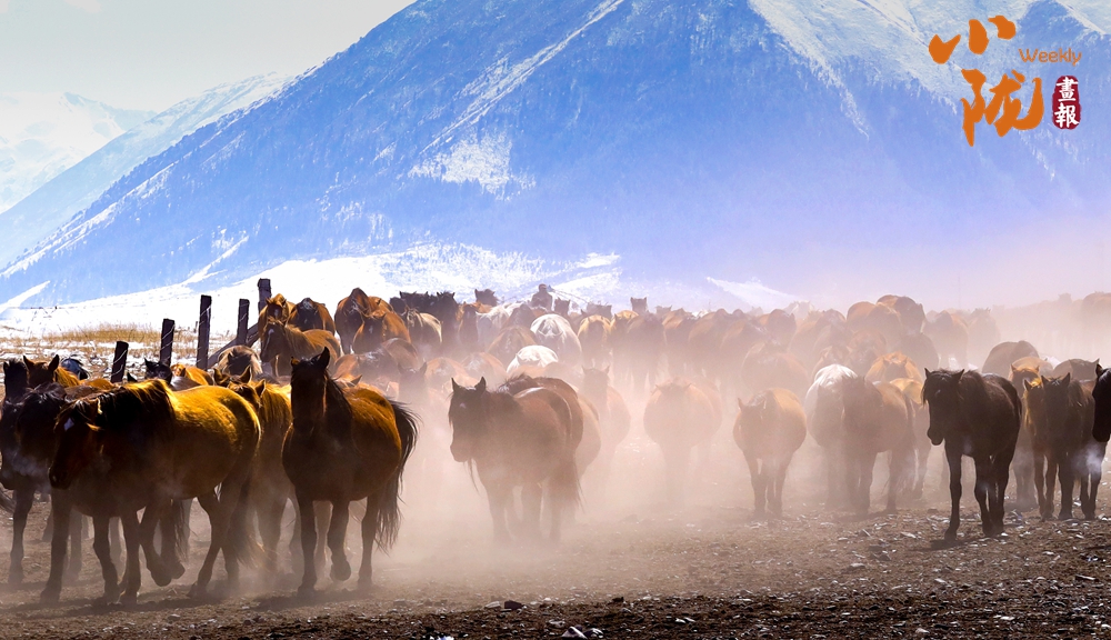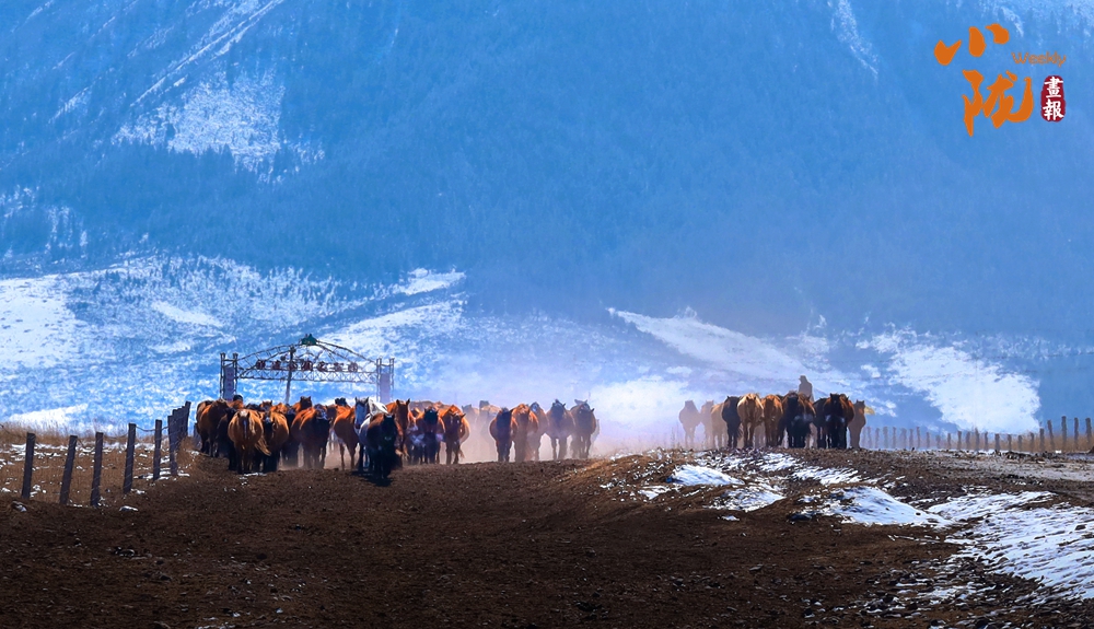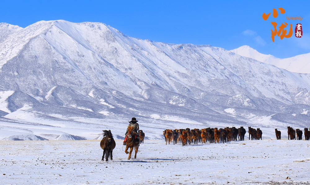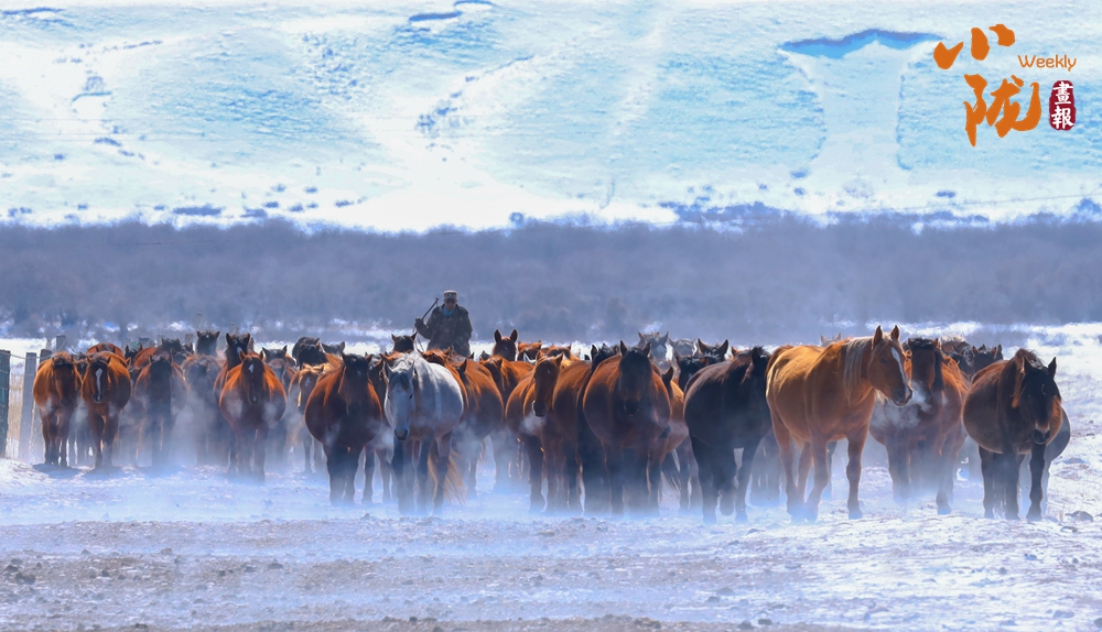牧民策馬揚(yáng)鞭,驅(qū)趕著馬群在積雪中飛馳。駿馬矯健的身姿如靈動(dòng)音符,奏響春日里激昂旋律。
