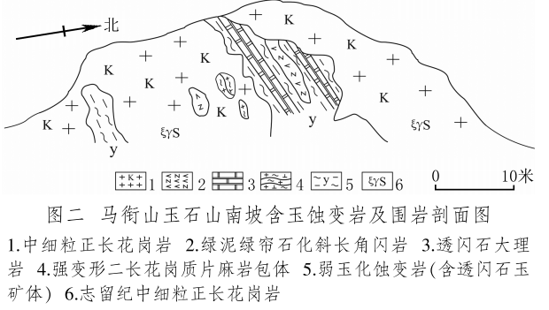 馬銜山玉礦分布在馬銜山東南部的玉石山(圖版一),海拔3028米。山上出露的地質(zhì)體主要為古元古界馬銜山巖群、中元古代片麻二長花崗質(zhì)巖[3]和志留紀正長花崗巖及正長巖。馬銜山巖群的巖性為黑云斜長片麻巖、變粒巖、斜長角閃巖和白云質(zhì)大理巖,巖石普遍遭受了韌性變形,變余糜稜巖發(fā)育。志留紀巖漿侵入期后熱液活動較強,石英脈細脈發(fā)育,局部見螢石礦化或礦床[4]。玉礦化主要產(chǎn)于馬銜山巖群與志留紀正長花崗巖和正長巖接觸帶上(圖版二),具體賦存在與白云質(zhì)大理巖的接觸部位,是正長花崗巖及正長巖與鎂質(zhì)大理巖接觸交代蝕變的產(chǎn)物[5]?;◢弾r與片麻巖、變粒巖和斜長角閃巖接觸界線附近巖石雖有蝕變,但不見玉化蝕變巖或玉石出露。在近山頂開采玉石揭露的一個地質(zhì)剖面清晰地顯示了這些特征(圖二)。該剖面大致呈東西走向,長約50米,馬銜山巖群多呈殘留體出露,斜長角閃巖綠泥綠簾石化強烈,大理巖普遍發(fā)生蝕變,形成透輝透閃石大理巖,緊靠花崗巖接觸地帶發(fā)育窄窄的透閃石玉礦帶?,F(xiàn)在人們找玉,也主要在該剖面上的花崗巖和鎂質(zhì)大理巖的接觸帶上鑿洞,在接觸帶上見有多處采挖玉石的洞穴。在該剖面西側(cè)約50米,發(fā)育有正長巖與大理巖的混染帶,肉紅色正長巖中包裹混染著大量灰綠色透閃透輝大理巖,部分已蝕變?yōu)橥搁W透輝石巖,且質(zhì)地較細膩,成為半玉化巖石。剖面和周圍地質(zhì)特征表明,玉礦的形成是早古生代志留紀花崗質(zhì)雜巖體侵入到古元古代鎂質(zhì)大理巖,發(fā)生接觸交代蝕變作用的結(jié)果,在兩種巖石接觸帶形成玉礦體。但并不是蝕變帶中的巖石都是透閃石玉石,透閃石玉在蝕變帶中多呈雞窩狀或不規(guī)則狀分布,少量呈脈狀出露。從剖面及部分采坑的規(guī)模來看,玉礦體向深處有變大、變好的趨勢,這主要受控于接觸面產(chǎn)狀,在傾角較緩處礦體相對較大。橫向上在背離接觸面方向圍巖具有從透閃石玉到透閃透輝石玉、透閃透輝石大理巖再到含透閃石大理巖的變化特征,反映了交代蝕變強度與接觸帶溫度及熱液成分變化的密切關(guān)系。從玉礦體到蝕變圍巖由于成分和結(jié)構(gòu)的變化出現(xiàn)一系列不同類型的玉石或巖石。我們在剖面上采集到一些小塊的淡綠色玉料(圖版三)和出露較寬的微晶大理巖,經(jīng)偏光顯微鏡下薄片鑒定和XRF檢測,確定有透閃石玉、透輝透閃玉、透閃透輝石玉、透閃透輝石大理巖和含透閃石大理巖等,這與馬家窯遺址出土的齊家文化時期大部分玉質(zhì)品玉料類型基本一致[6]。部分地段近礦圍巖還有透輝石巖、透輝矽卡巖、矽卡巖化大理巖、蛇紋石化大理巖、斜長透輝石巖等。玉石山的采洞(坑)由于資源與環(huán)境保護的要求,大多已被填埋,但仍可見采坑殘留的位置。采洞(坑)均位于大理巖與正長花崗巖接觸帶靠近大理巖一側(cè),這也間接顯示了玉礦體的位置。此外,玉石山花崗巖中石英細脈較發(fā)育,局部可見螢石礦化,反映了花崗巖侵入期后低溫?zé)嵋夯顒尤暂^強,對玉礦也有一定的改造影響。