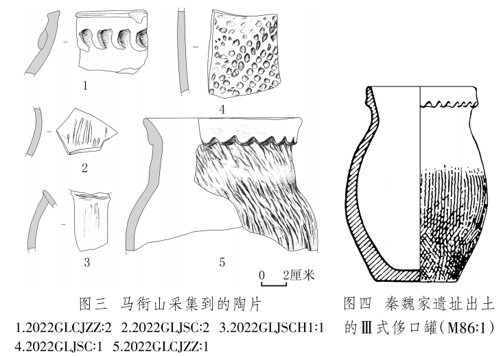 陶片 2片,2022GLCJZZ∶1,罐殘片,夾砂紅陶,腹部以下缺失。侈口,上有煙熏痕跡。短頸,頸上部有一圈鋸齒狀凸飾,鼓腹,頸部和腹部滿飾粗繩紋。復(fù)原口徑12、器壁厚0.6~1、殘高10厘米(圖三,5)。與秦魏家遺址出土的齊家文化Ⅲ式侈口罐(圖四)[16]形制相似。2022GLCJZZ∶2,罐口沿殘片,夾砂紅陶。口沿下有月牙狀附加堆紋??谘貧堥L5.3、殘高4.8、厚0.7厘米(圖三,1)。