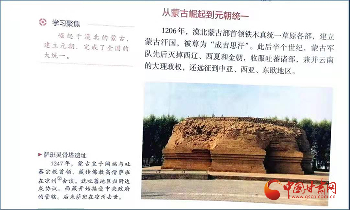在高一歷史課本第56頁(yè)中外歷史綱要(上)第三單元有一段記錄“涼州會(huì)談”的簡(jiǎn)要文字:“1247年,蒙古皇子闊端與吐蕃宗教首領(lǐng)、藏傳佛教高僧薩班在涼州會(huì)談,就吐蕃地區(qū)歸附達(dá)成協(xié)議。西藏開始接受中央政府的管轄。后來薩班在涼州去世。”文字右上角是一張薩班靈骨塔遺址配圖。