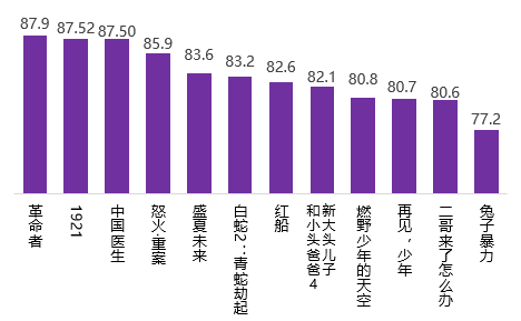 調(diào)查顯示,《革命者》《1921》《中國醫(yī)生》三部影片的滿意度得分分別為87.9分、87.52分、87.50分,分列2021年暑期檔影片滿意度排序的前三位。動作片《怒火·重案》、青春片《盛夏未來》和動畫片《白蛇2:青蛇劫起》滿意度居檔期第4至6位。