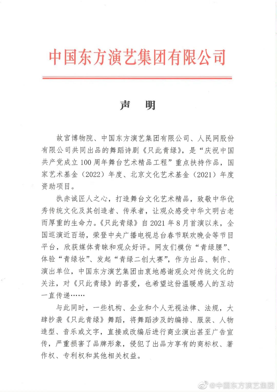 作為舞蹈詩(shī)劇《只此青綠》出品方之一,中國(guó)東方演藝集團(tuán)25日發(fā)表聲明,已啟動(dòng)對(duì)《只此青綠》的全面維權(quán)行動(dòng)。