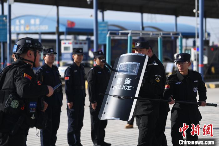 1月7日,甘肅省酒泉市瓜州縣公安局柳園公安檢查站內(nèi),執(zhí)勤民輔警進行日常演練。李亞龍 攝