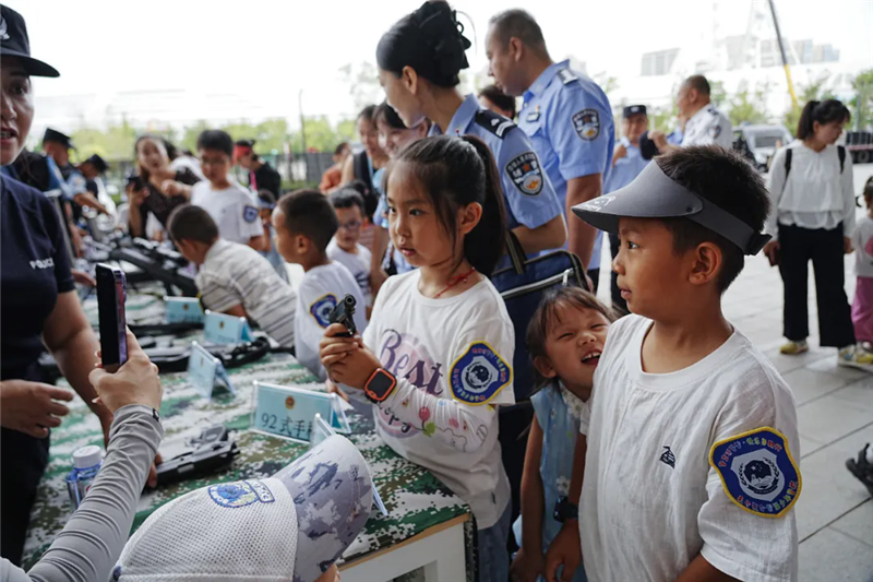 帶著興奮和期待,小朋友們的警營探索之旅開始了!在奧體中心警務(wù)站和警航作戰(zhàn)單元,他們沉浸式參觀了現(xiàn)代警務(wù)工作和警用無人機(jī)的指揮調(diào)度,直觀了解了公安工作的日常場景。另一邊,小朋友們在民警的指導(dǎo)下,一個(gè)個(gè)親手拿著警用武器裝備零距離“拍照打卡”,“這個(gè)好酷!”“看我的!”小朋友們的驚嘆聲此起彼伏。