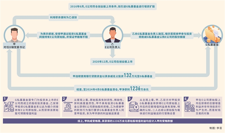 其中,2016年6月,E公司符合創(chuàng)業(yè)板上市條件,擬引進(jìn)G私募基金和H私募基金進(jìn)行增資擴(kuò)股。乙為感謝甲在企業(yè)用地審批等方面提供的幫助,提議安排甲通過投資G私募基金(該基金是專門為投資未上市的E公司而成立的股權(quán)投資基金,按照每股5.5元的價(jià)格取得E公司股本600萬股,并辦理相應(yīng)的變更登記手續(xù))間接持有E公司原始股,并告知甲E公司擬上市情況以及其會(huì)與G私募基金簽訂對賭協(xié)議(若E公司未實(shí)現(xiàn)上市,G私募基金有權(quán)要求乙原價(jià)回購,并按照年利率10%支付補(bǔ)償款),甲無需承擔(dān)市場風(fēng)險(xiǎn),穩(wěn)賺不賠,甲表示同意。此后,乙向G私募基金負(fù)責(zé)人施壓,暗示若拒絕甲參與投資將削減G私募基金認(rèn)購E公司的股份額度,并將該額度交由其競爭對手H私募基金認(rèn)購。隨后,甲違規(guī)使用銀行貸款資金以其親戚名義投資132萬元至G私募基金(根據(jù)相關(guān)規(guī)定,私募基金投資者應(yīng)當(dāng)具備相應(yīng)資金實(shí)力,不得用貸款資金從事股本權(quán)益性投資,甲的行為不符合規(guī)定)。2019年6月,I私募基金以每股11.52元溢價(jià)收購G私募基金持有的部分E公司股份。2020年12月,E公司在創(chuàng)業(yè)板上市。經(jīng)查,至2024年4月G私募基金清倉,甲凈獲利1236萬余元。