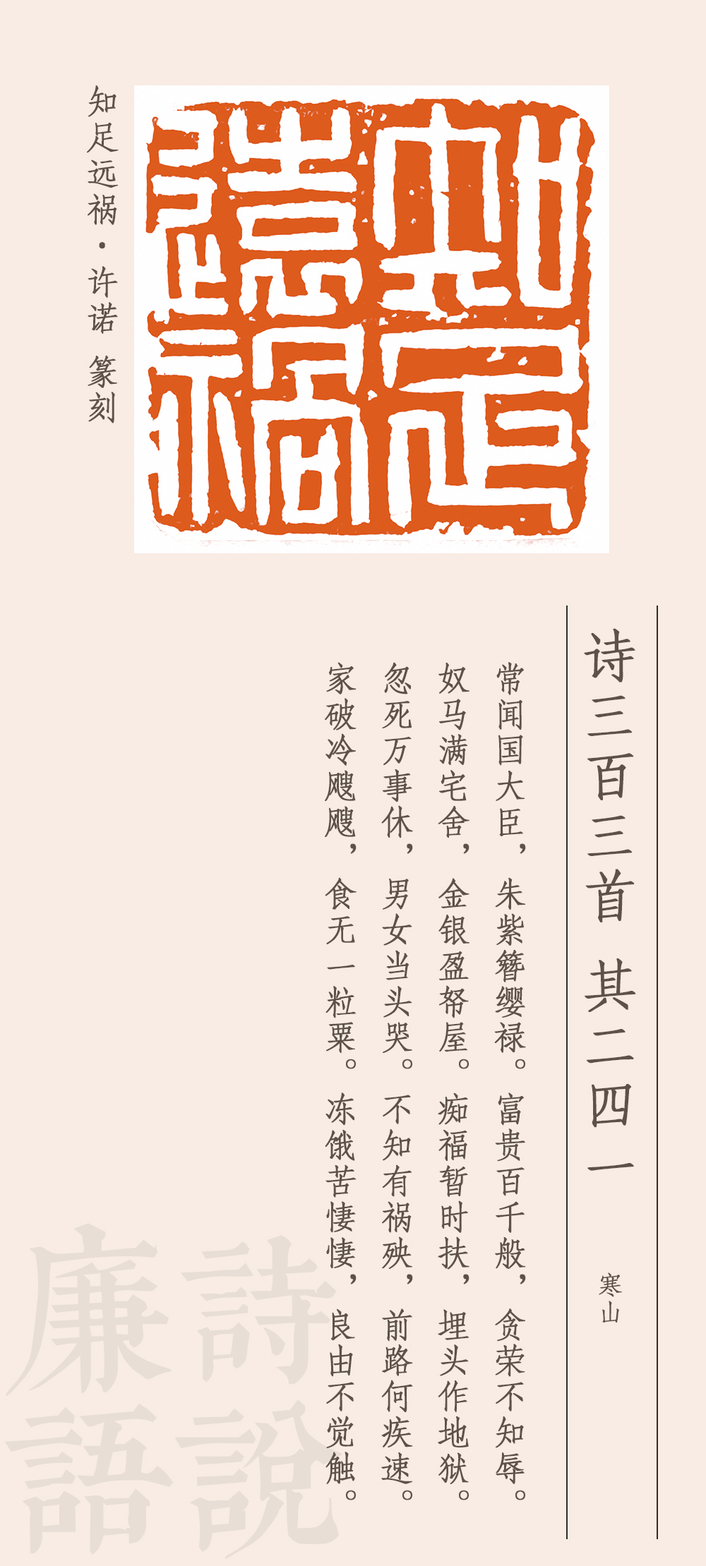 這首詩(shī)是諷刺高官貪圖富貴、聚斂財(cái)物的。他說,有些國(guó)之大臣,穿戴尊榮,好不威風(fēng),享受千般榮華富貴,卻一點(diǎn)兒都不顧及廉恥榮辱,家中擁有大量駿馬奴仆,屋子里堆滿金銀財(cái)寶,自以為這是在享福,其實(shí)是在給自己挖墳?zāi)沟鬲z。一旦死去,萬(wàn)事皆休,富貴是無(wú)法永久保留的。如果因貪腐而遭受禍殃,那下場(chǎng)就會(huì)很慘。家破人亡,挨凍受餓,凄風(fēng)苦雨,苦不堪言。最后一句卒章顯志:之所以會(huì)有這樣的遭遇和結(jié)局,是因?yàn)闆]有悟透取禍的原因。這個(gè)原因從前面所述來(lái)看,就是太貪婪、不知足。