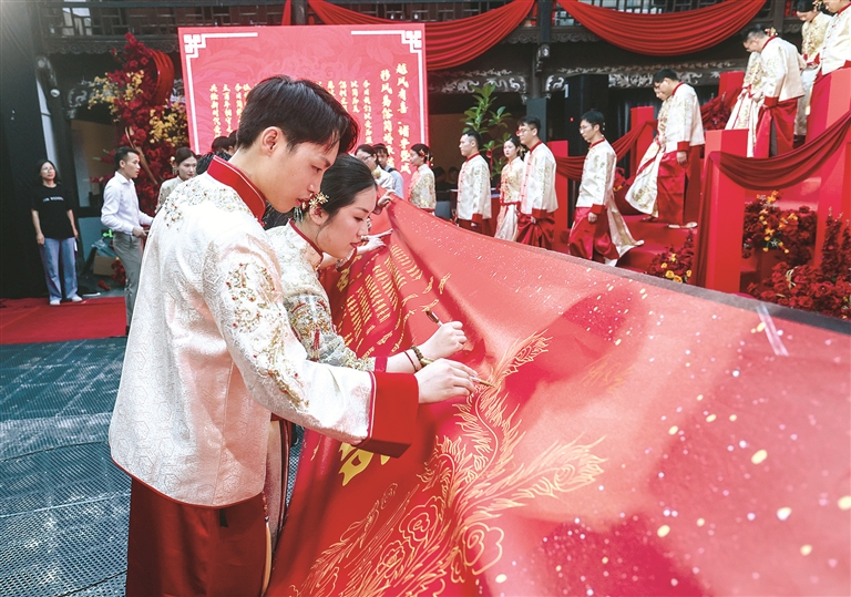 風(fēng)成于上、俗化于下。近年來,越來越多新人選擇集體婚禮,倡導(dǎo)文明簡約的婚嫁理念,通過精心設(shè)計的集體婚禮儀式,打造既莊重又溫馨的婚禮體驗,既減輕經(jīng)濟負(fù)擔(dān)、又傳承美好家風(fēng),倡導(dǎo)婚俗改革文明新風(fēng)尚。圖為在浙江省諸暨市西施故里景區(qū)內(nèi),參加集體婚禮儀式的新人們簽訂移風(fēng)易俗簡婚承諾。新華社記者 徐昱 攝